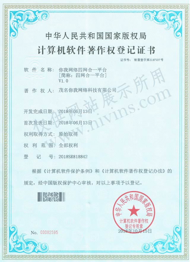 熱烈祝賀茂名你我網(wǎng)絡科技有限公司獲得了中華人民共和國國家版權局頒發(fā)的《計算機軟件著作權登記證書》,被認定為軟件——“你我網(wǎng)絡四網(wǎng)合一平臺V1.0”的法定著作權人,登記號:2018SR818842,證書號:軟著登字第3147937號。