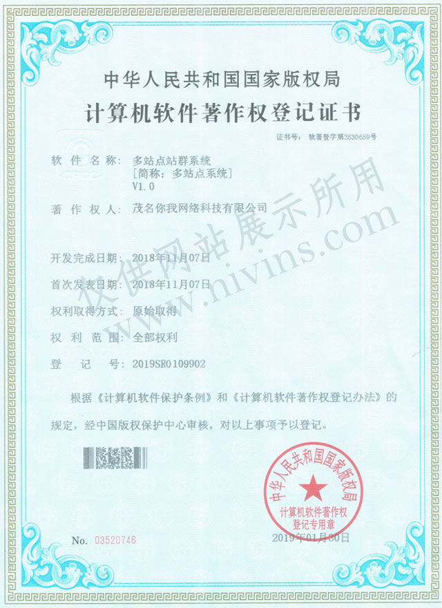 熱烈祝賀茂名你我網(wǎng)絡(luò)科技有限公司獲得了中華人民共和國國家版權(quán)局頒發(fā)的《計算機(jī)軟件著作權(quán)登記證書》,被認(rèn)定為軟件——“多站點站群系統(tǒng)V1.0”的法定著作權(quán)人,登記號:2019SR0109902,證書號:軟著登字第3530659號。
